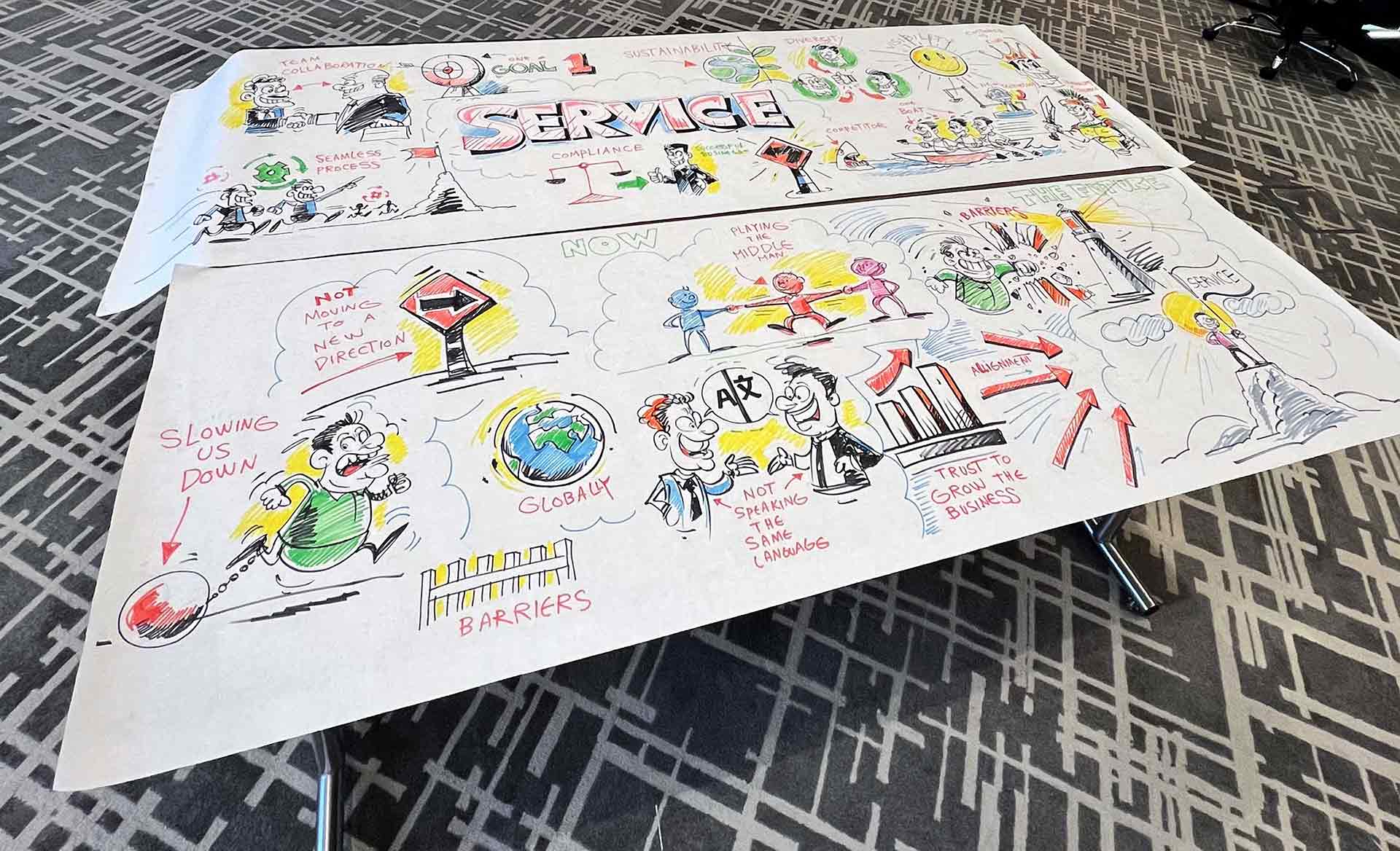 نموذج من العمل الذي قمنا به لجلسة عصف ذهني مع شركة كاتربيلر وشركة اس بي ام للنفط والغاز. تم تنفيذ ذلك باستخدام الطريقة التقليدية بقلم الحبر وأقلام الرصاص الملونة على الورق لتصوير الأفكار التي تمت مشاركتها في جلسة العصف الذهني في دبي